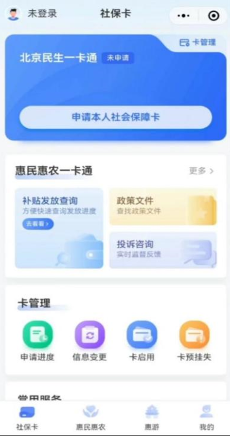 第一步,进入北京民生一卡通小程序,点击“申请本人社会保障卡”后,选择“手机号快捷登录”或手机验证码登录。