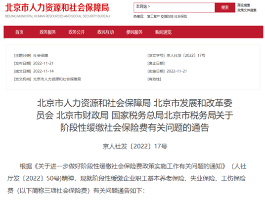 北京市人力社保局等四部门联合发布《关于阶段性缓缴社会保险费有关问题的通告》,要求在原阶段性缓缴三项社保费政策的基础上,进一步延长缓缴到期后补缴的期限,延长至2023年底缴清。