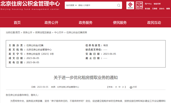 北京住房公积金管理中心发布《关于进一步优化租房提取业务的通知》,对租房提取业务做进一步优化,2023年6月5日起租房提取额度提高至每月2000元,并调整支付频率为按月提取。