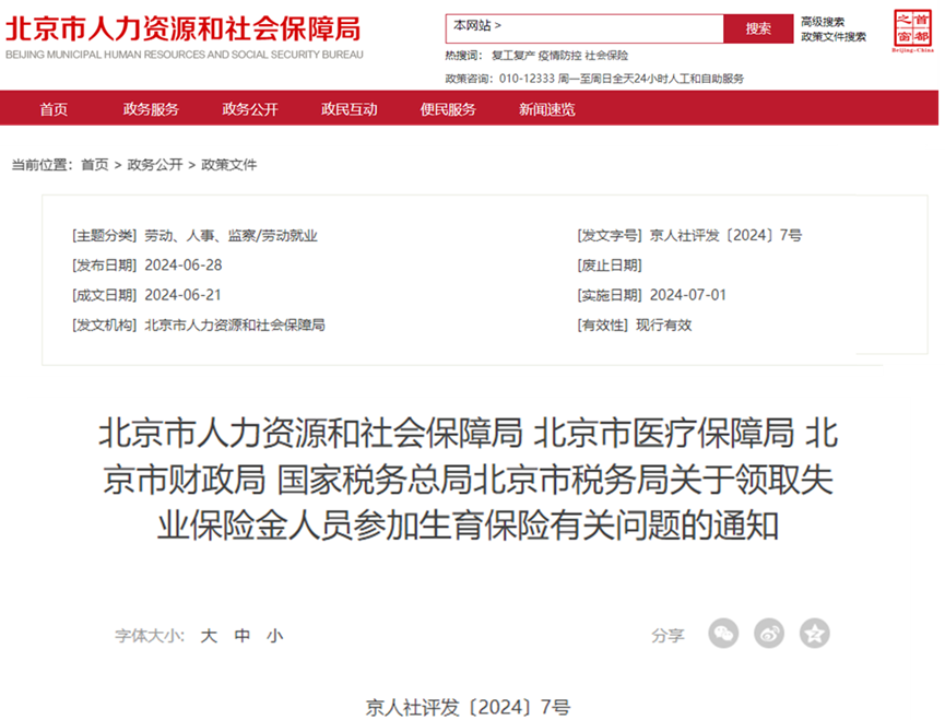 北京市人力社保局等四部门发布《关于领取失业保险金人员参加生育保险有关问题的通知》,明确从2024年7月1日起,失业人员领取失业保险金期间,在其职工基本医疗保险参保地同步参加生育保险,所需资金从失业保险基金列支,个人不缴费。