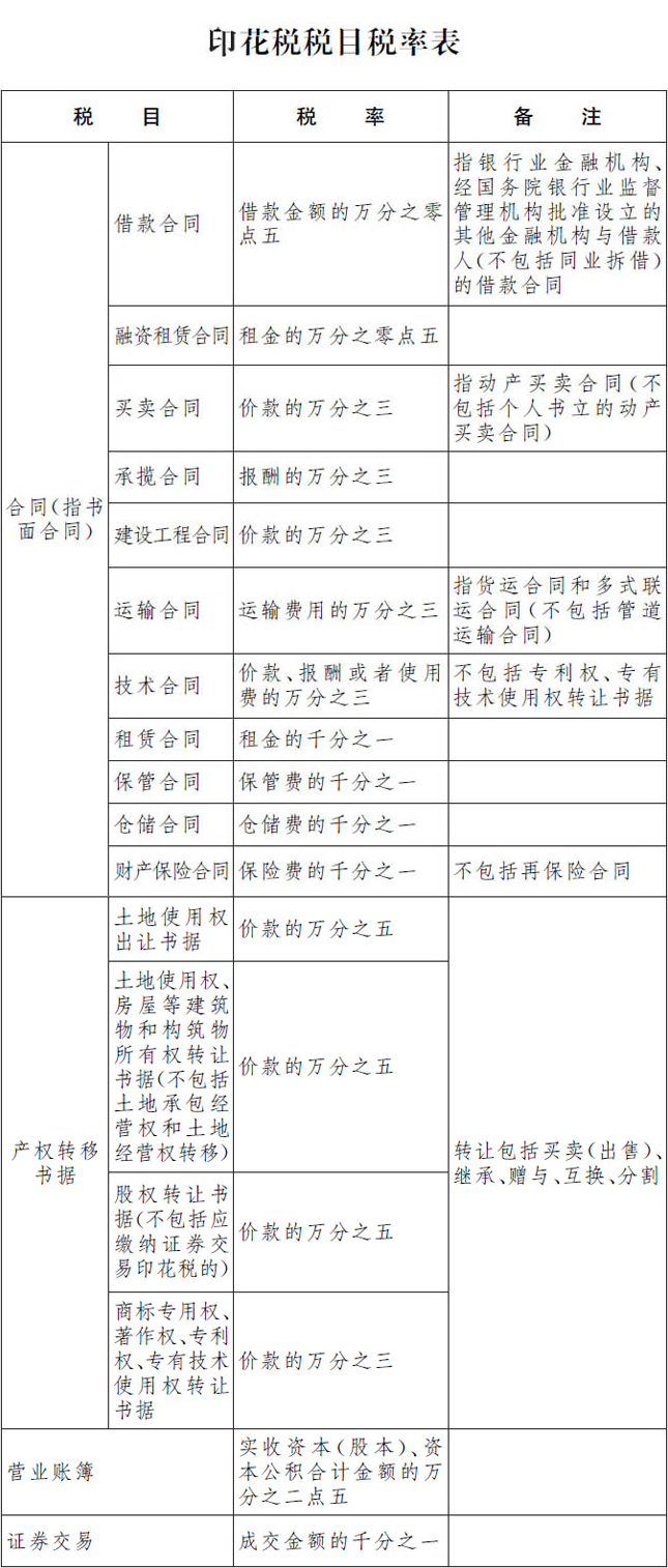 第四条 印花税的税目、税率,依照本法所附《印花税税目税率表》执行。