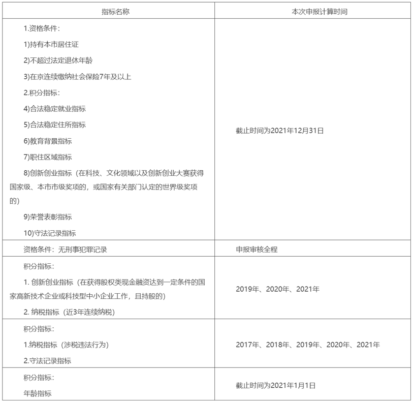 根据《北京市积分落户管理办法》(京政办发〔2020〕9号)和《北京市积分落户操作管理细则》(京人社开发发〔2020〕8号)规定,经报请市政府同意,现就2022年北京市积分落户申报工作通告如下: