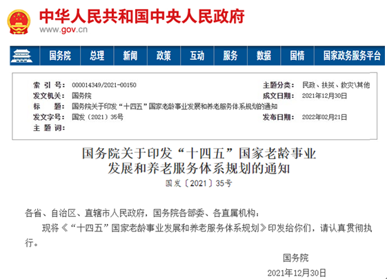 国务院印发《“十四五”国家老龄事业发展和养老服务体系规划》,对“十四五”期间养老事业和养老服务作出了全面的规划,同时提出 “实施渐进式延迟法定退休年龄”。