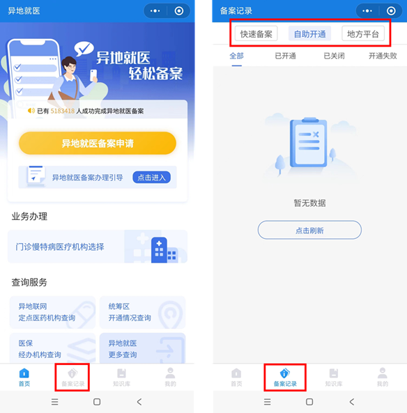 可通过国家医保服务平台APP或国家异地就医备案小程序线上办理的异地备案,可在“异地备案”界面,点击右下方“备案记录”,选择“自助开通”,查看异地备案状态和详情信息。